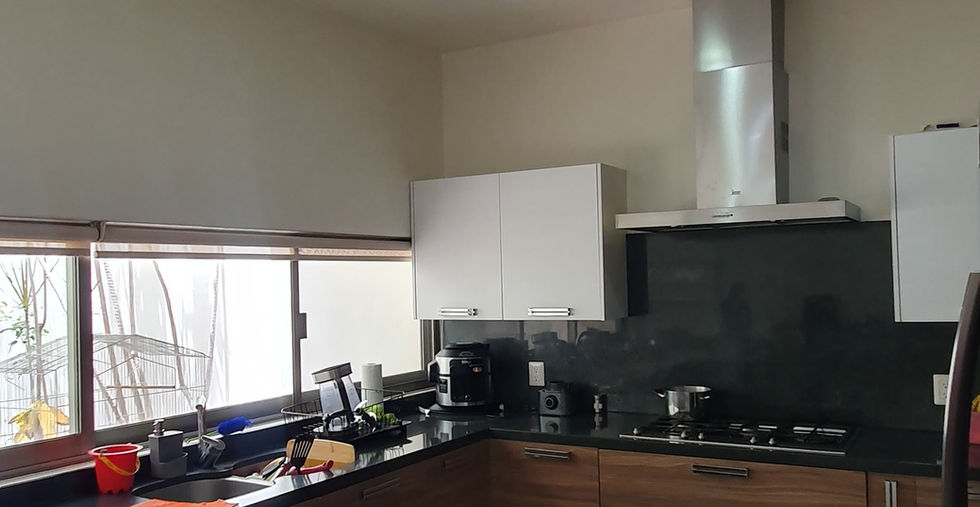 Planta baja: Cochera semicubierta para 3 automóviles, espacio sala - comedor, cocina integral, medio baño, terraza cubierta, cuarto de lavado, área de jardín.